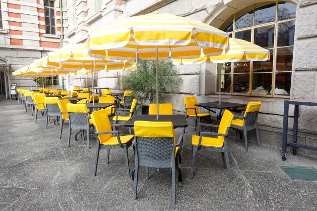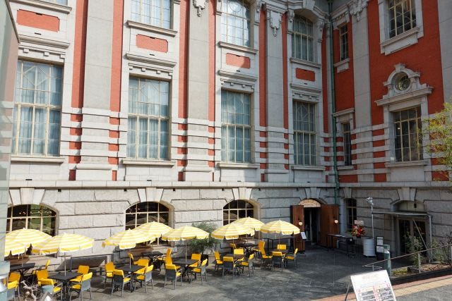 堂々とした存在感を放つ重要文化財「大阪市中央公会堂」の地下1階に、「DRAWING HOUSE OF NAKANOSHIMA」のエントランスがあります。イエローカラーのパラソルが目を引くテラス席も完備。これからの季節は、テラス席でくつろぐのも気持ちよさそう!