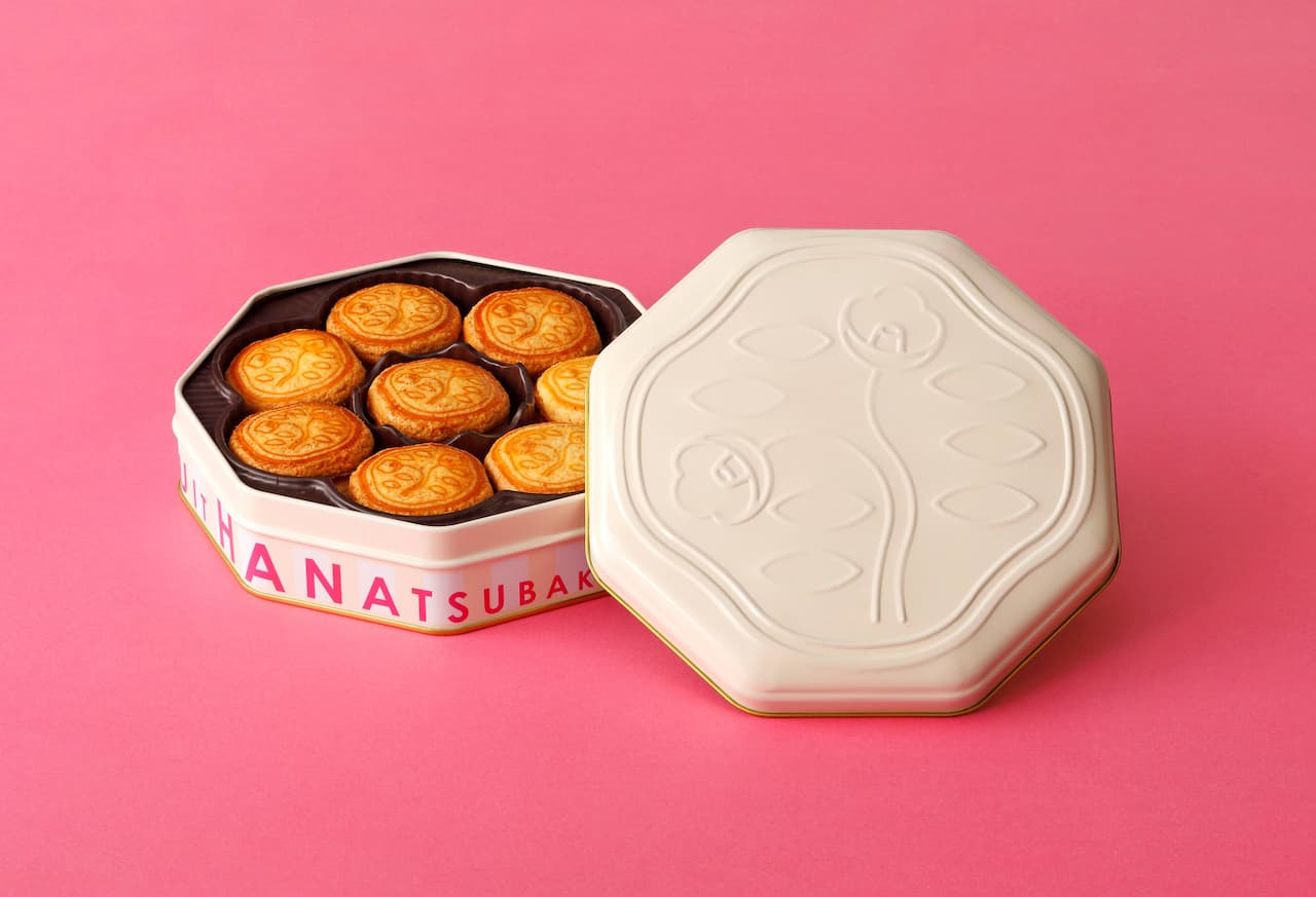 「花椿ビスケット24枚入限定缶 クラシックアイボリー」(2,160円) 花椿ビスケット限定缶では、側⾯に華やかなピンクで「BISCUIT HANATSUBAKI」のタイポグラフィがほどこされています。まるで洋菓子の原形のような、シンプルなレシピのビスケットこそ、昭和初期から誇りを持ってつくり続けてきた、「資生堂パーラー」を代表するお菓子です。