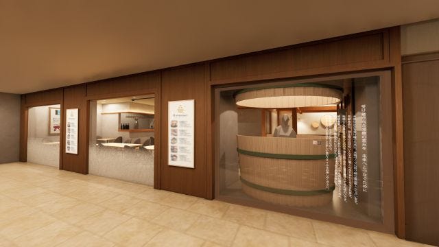 新店舗はベージュやブラウンを基調に、木桶、樽、瓶など発酵文化をイメージする素材を使い、 “蔵の温もり×洗練された都会感” が演出されています。
