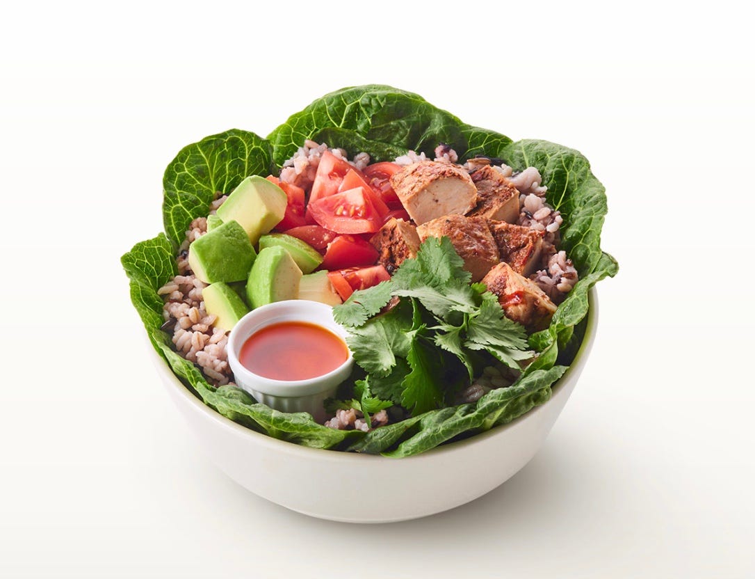 レタス、チキン、トマト、シラントロ、アボカドを合わせたチキンタコスのような味わい。ベースとなるシャキシャキのレタスに、ジューシーなチキン、フレッシュなトマト、香りのアクセントとなるシラントロ(パクチー)、そして濃厚でクリーミーなアボカドを贅沢にトッピング。ヘルシーながらもしっかりとした食べ応えがある一品。彩り豊かなパワーボウルでピクニックやランチタイムを楽しんでみて。