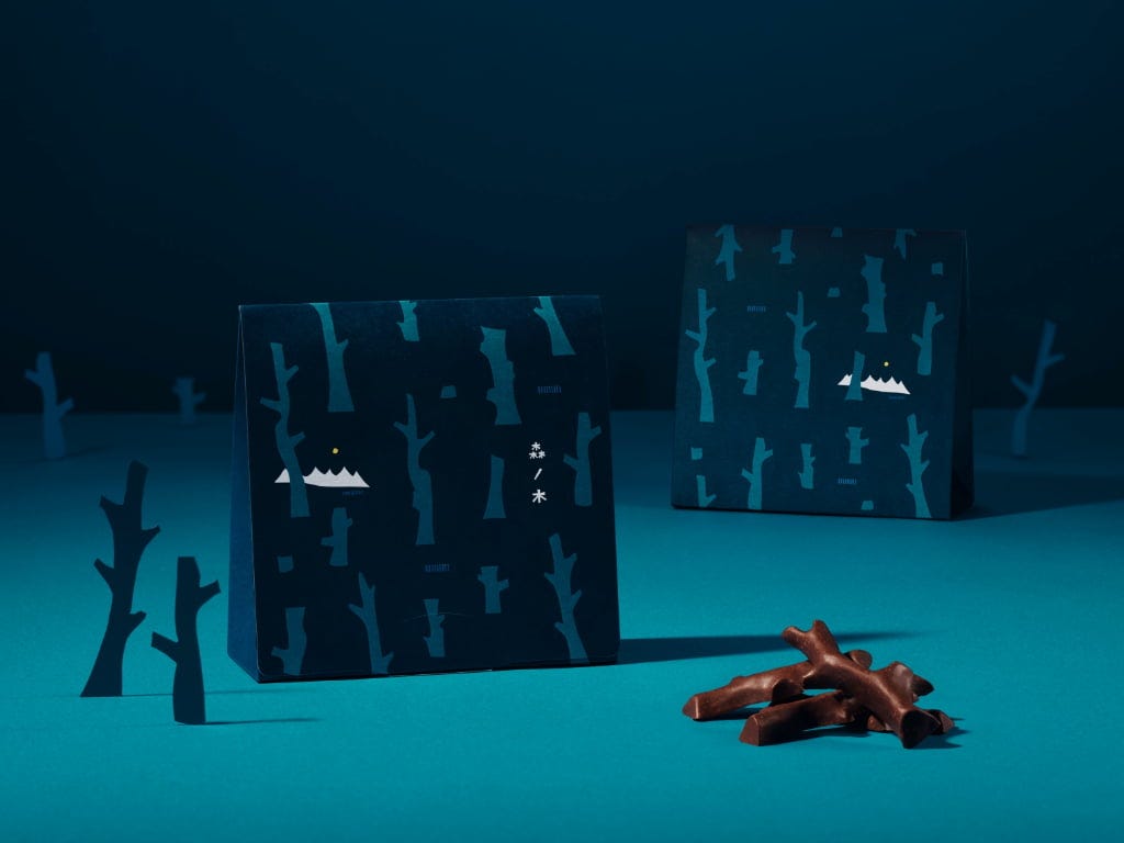 「森ノ木 黒」(1箱8本入り/1,242円) そのほか、生地に練り込んだチョコレート、チップスに噴霧したチョコレート、最後に纏わせる粒状のチョコレートのトリプルチョコレートが味わえる「スノーチップス」や、薄く焼いたクレープ生地を砕いたフィアンティーヌ、細かく刻んだローストアーモンド、香ばしいパイを混ぜ込んだクランチチョコレート「森ノ木 黒」も登場します。