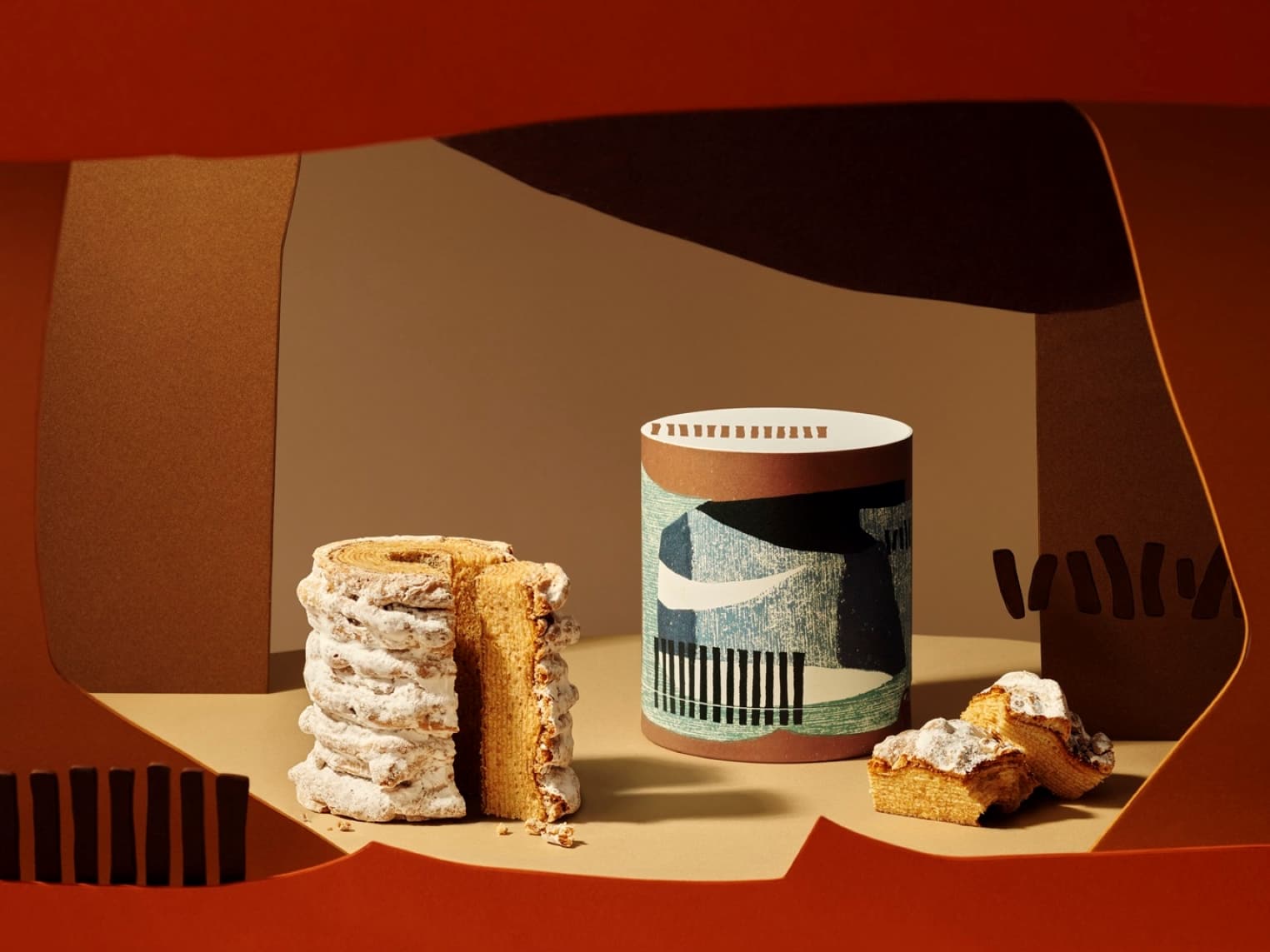 冬の放牧牛乳を使ったしっとりバームクーヘンに、マカロン生地をかけて二度焼きし、木肌のように仕上げたひと品。今シーズン、ポップアップストアで購入できるのは「阪急うめだ本店」だけなのだとか!