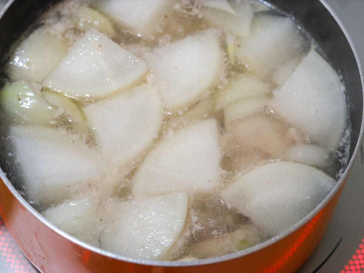 ③鍋に鶏手羽元、たまねぎ、大根、にんにくを入れ、水、酒、塩を加えたら強火で煮る。