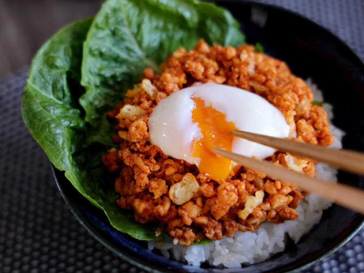 「だまされたと思ってこれ入れてみて!」「サクサクが美味しい」韓国屋台風ヤンニョムそぼろ丼
