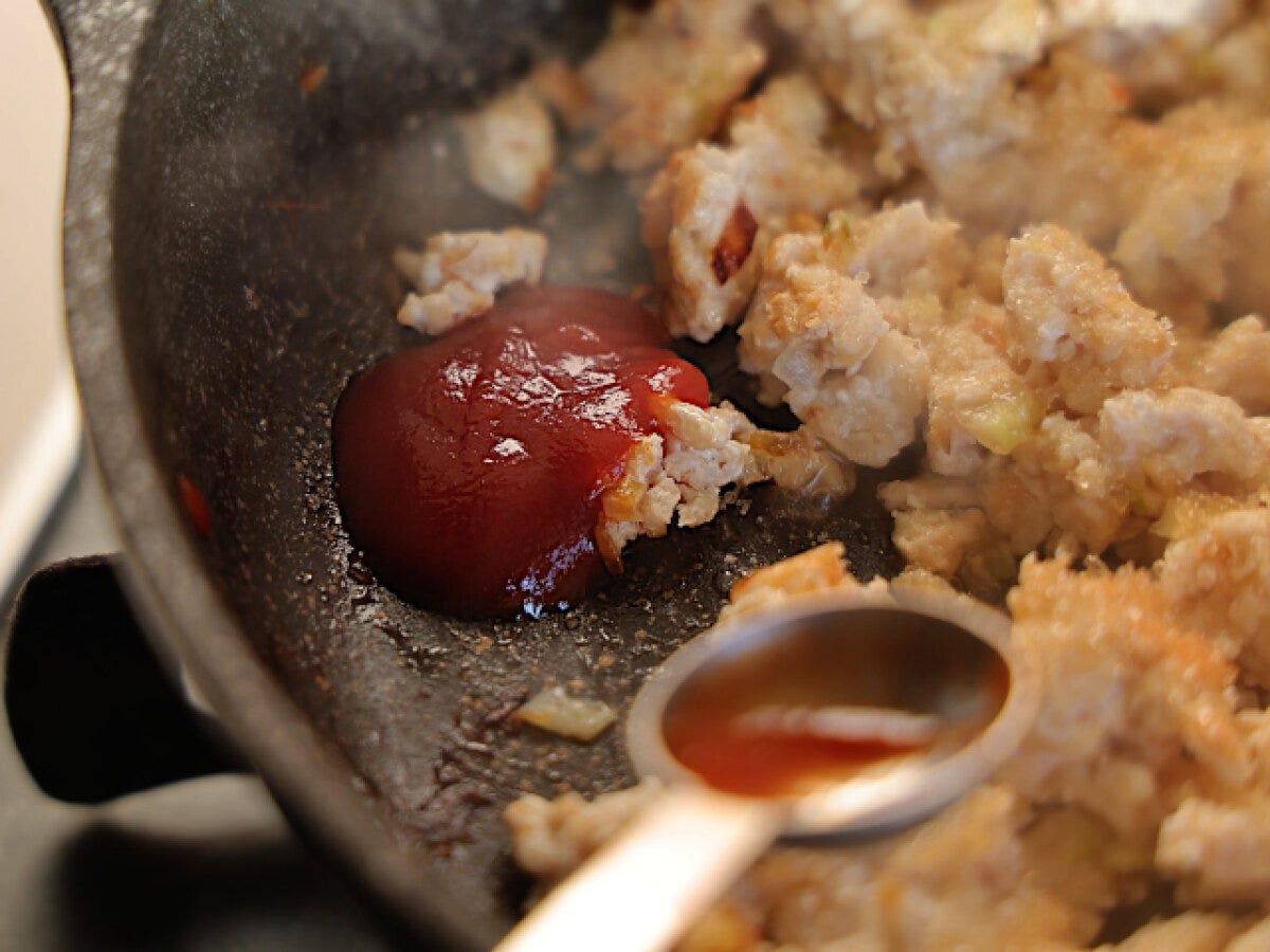 ③ 砂糖とケチャップを入れる。ケチャップはフライパンのすき間で軽く炒めてから混ぜる。