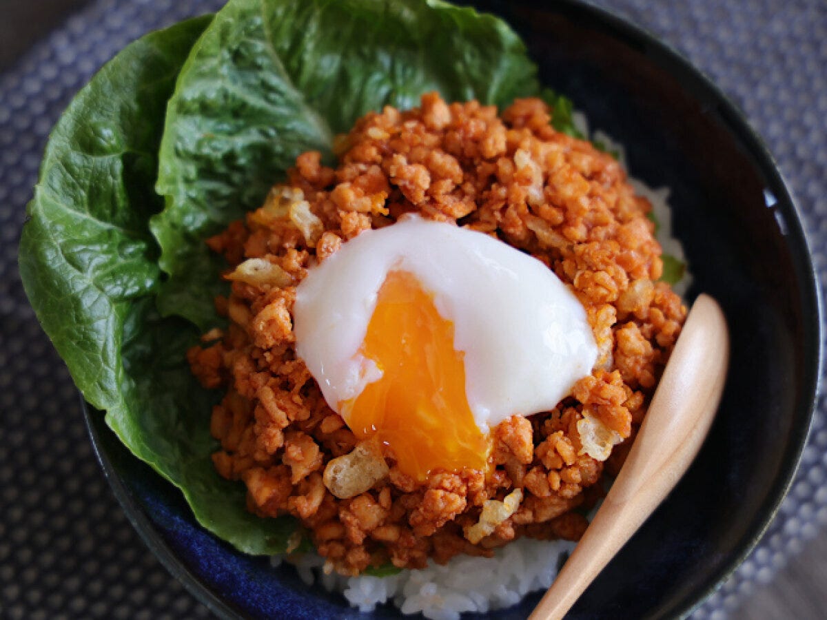ナチュラルフード・コーディネーターの茂木奈央美です。甘くてピリ辛な韓国屋台のヤンニョムチキンを、家で作りやすいそぼろ丼にアレンジしました。サクサクの秘密は、後入れの天かす。食感はもちろん、コクも増します。仕上げの温泉卵が全体をまろやかにしてくれ、思わずかきこみたくなるレシピをご紹介します。