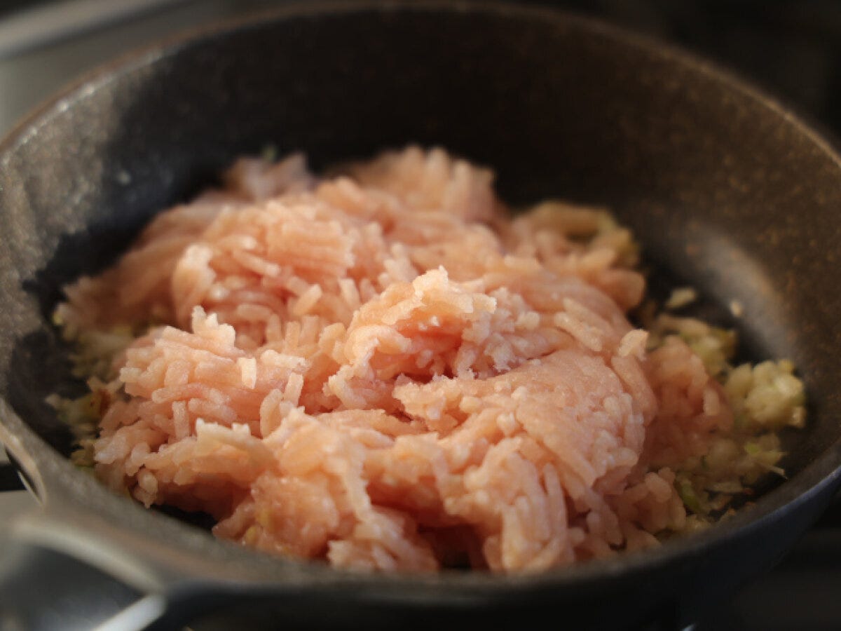② 鶏ひき肉を入れて焼き付け、表面の一部がこんがりしてきたら、崩しながら炒める。