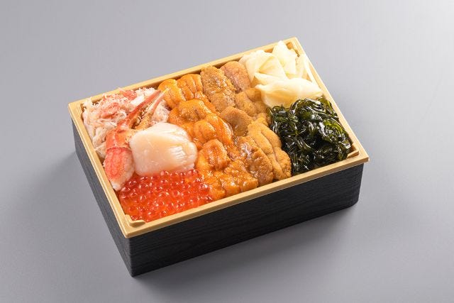 うに専門店 世壱屋「北海二色雲丹海宝弁当」3,996円 <各日30点限り> 「うに専門店 世壱屋」からは、味わいの異なる2種類のウニが主役のお弁当を。濃厚な旨みのバフンウニと上品な甘みのムラサキウニを一度に味わえ、さらにイクラ、カニ、ホタテを添えた見た目もお腹も大満足の贅沢な一折です。