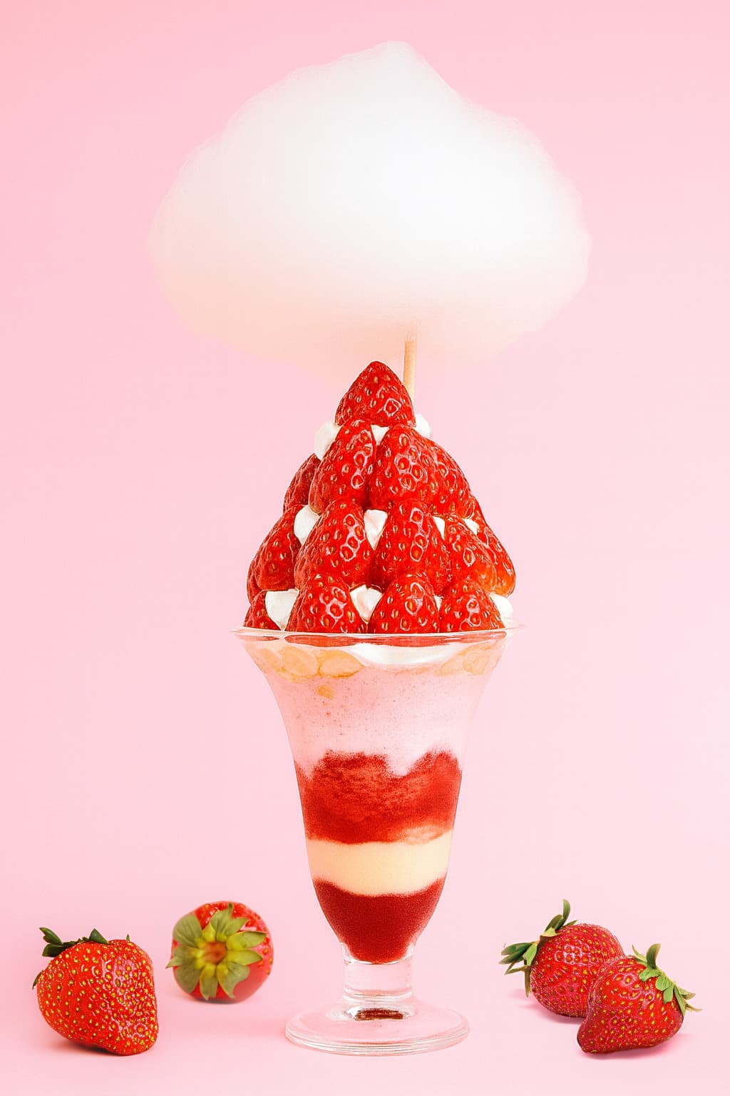 ふるーつなのに「贅沢いちごの⾷べ⽐べマウンテンパフェ」 そのほか、いちごとチョコレートを使った「DIVERTENTE」のイベント限定ピッツァや、推しカラーのいちご型容器が選べる「STRAWBERRY HOUSES」のいちごミルク、⾃家製いちごソースとムース、フレッシュいちごを⼭盛りに重ね、大胆にわたあめをのせた「ふるーつなのに」のパフェなど、個性派も勢ぞろい!