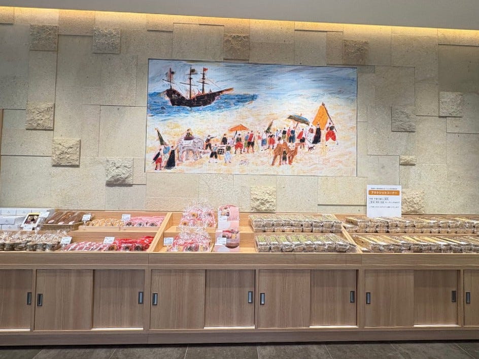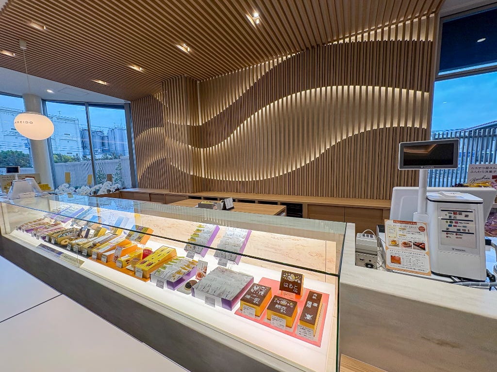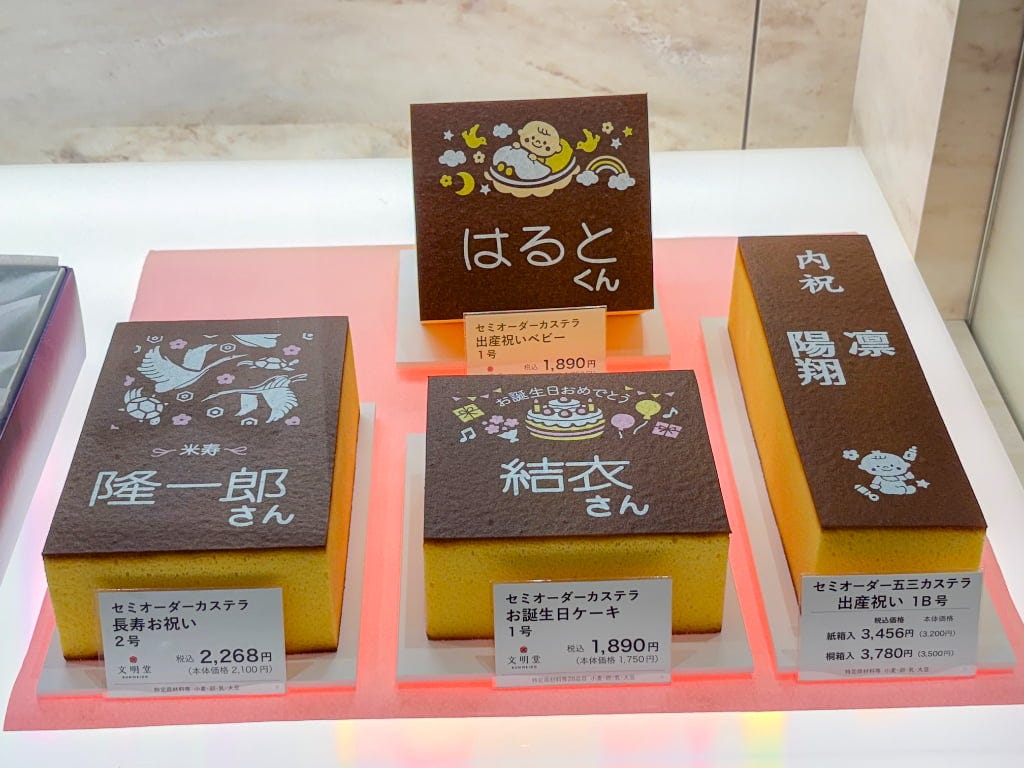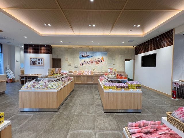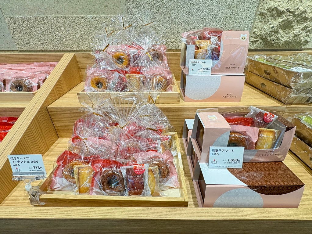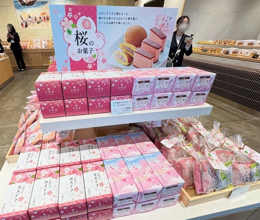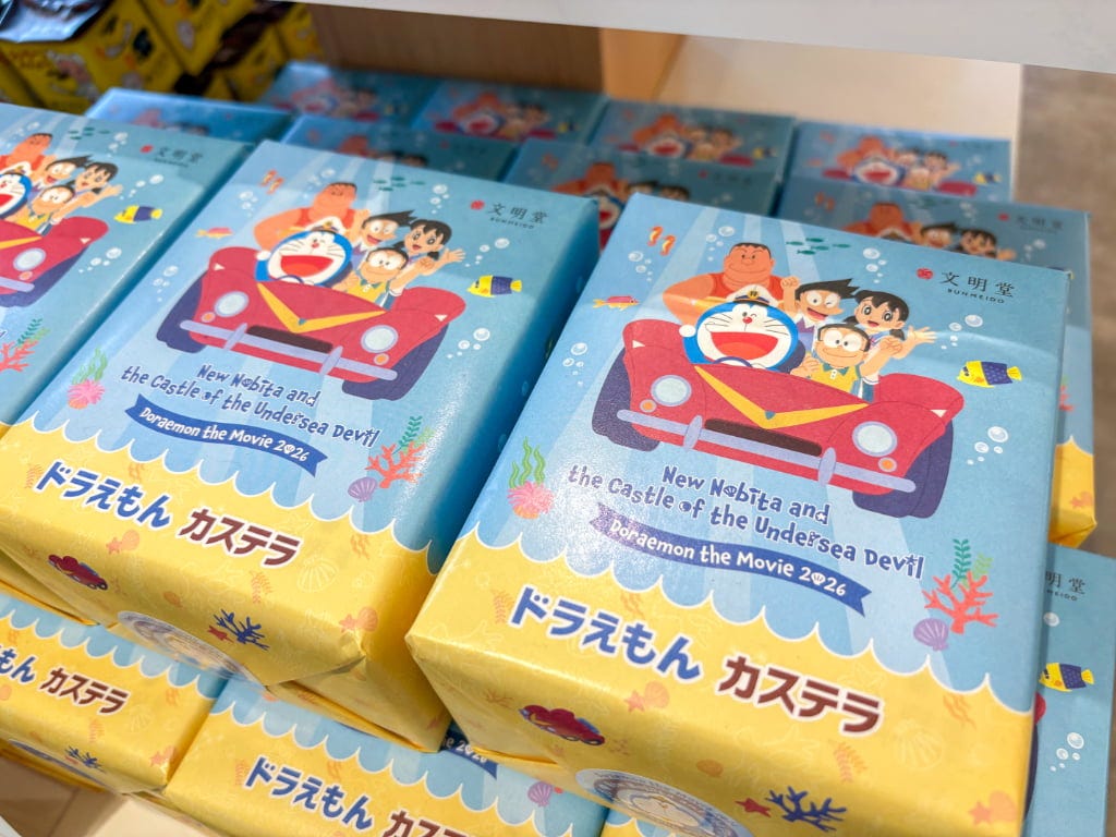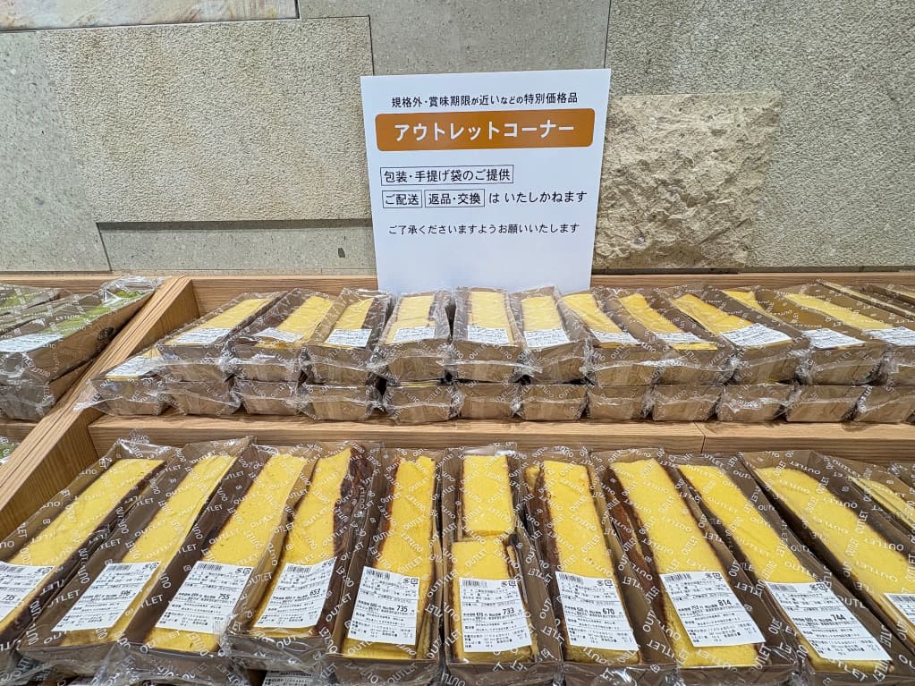 店内には、まだまだ気になる商品がずらりと並びます。ドラえもんシリーズや季節限定桜のお菓子、パンケーキやプリン、セミオーダーカステラ、アウトレットコーナーなど勢揃い。3時のおやつからギフトまで、いろいろなシーンに活躍してくれそうです。
