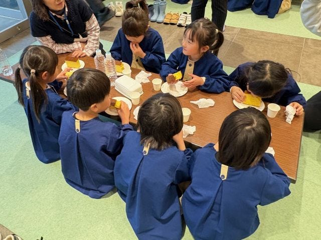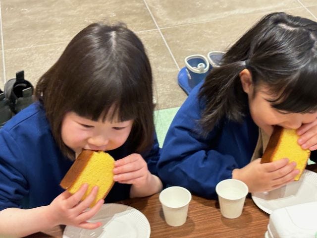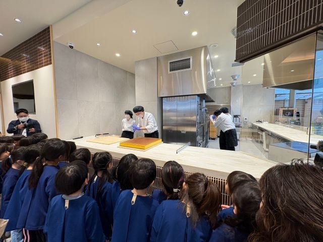 また、地元保育園の園児たちへのお披露目も実施。子どもたちは、釜出しカステラのカットの見学や試食を楽しみました。