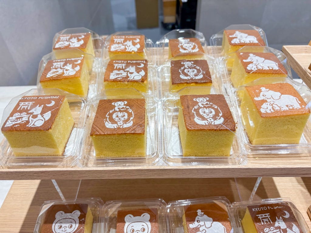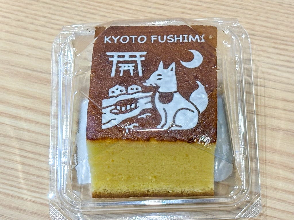 「国産バターのくちどけカステラ」は、カルピス(株)バターを使用し、くちどけなめらかに仕立てられています。4種のかわいいイラストが揃い、地元の伏見稲荷大社をモチーフにしたデザインは京都土産にもぴったりです。