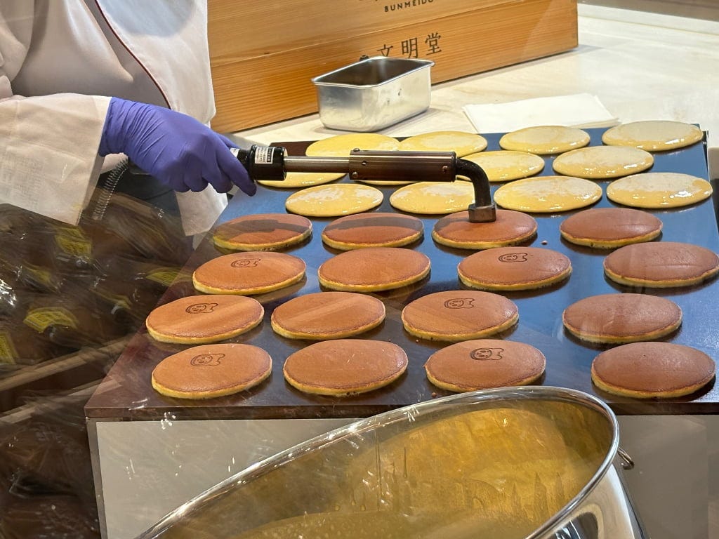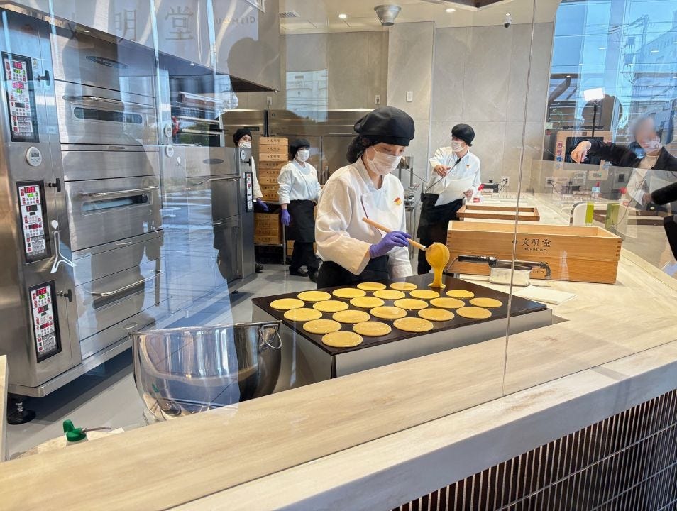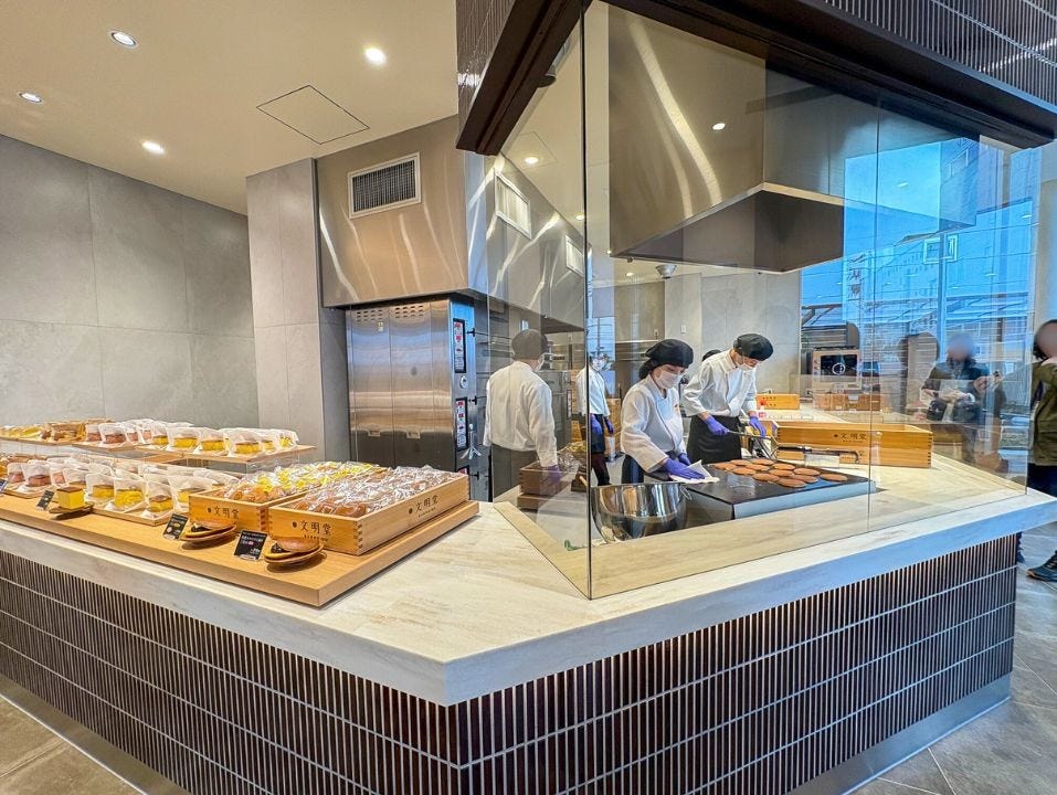 仕切りを使わず、ダイレクトに菓子を焼き上げる音や香りを体験できる、文明堂東京初のガラスレスのキッチンを採用。カステラやどら焼きが作られる様子を目の前で見ていると、その臨場感にワクワクがとまりません!