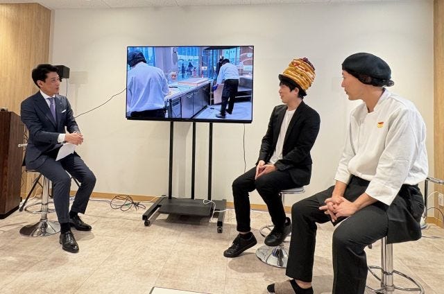 発表会では、文明堂東京・代表取締役社長の宮﨑進司さん、スイーツ芸人として活躍中のスイーツなかのさん、工房長の池内厚志さんが登場し、たくさんの工程を経て丁寧に作り上げる「釜出しカステラ」のこだわりについて紹介がありました。