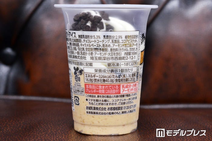 もうひとつの「たべる牧場大阪ブラックサンダーキャラメル味」は、ファミリーマートの定番アイス「たべる牧場」で、「大阪ブラックサンダー」 のコテコテな味わいをイメージしたもの。こちらは1個あたり326カロリー。お馴染みのミルクアイスに、クッキーを混ぜ込んだキャラメルアイス、天面と中間層にココアクッキーを組み合わせ、ザクザク食感が楽しめるよう仕上げています。ミルクアイスの層は従来の「たべる牧場」同様、すっきりとした飽きのこない甘さ。スプーンでひと掬いすると、中にもザクザクのココアクッキーがたっぷり。キャラメルアイスの中にもコーチングクッキーが混ぜ込まれていて、こちらはさくっと軽い食感。ザクザク固めなココアクッキーとはまた違う食感を楽しむことができ、キャラメルとクッキー要素のおかげでコテコテな味がきちんと再現されています。