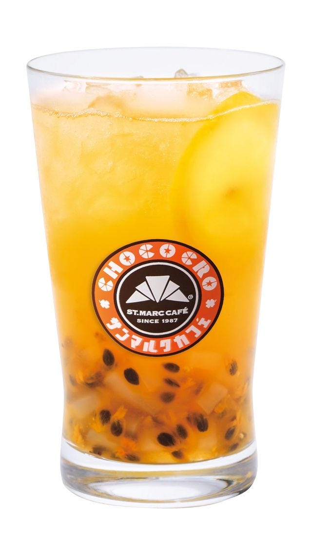 「ジャスミンフルーツティー パイナップル&パッションフルーツ&レモン」750円 ジャスミンの⽢く華やかな⾹りと、レモンやパッションフルーツの爽やかさが好相性。ナタデココの⾷感も楽しい一杯です。