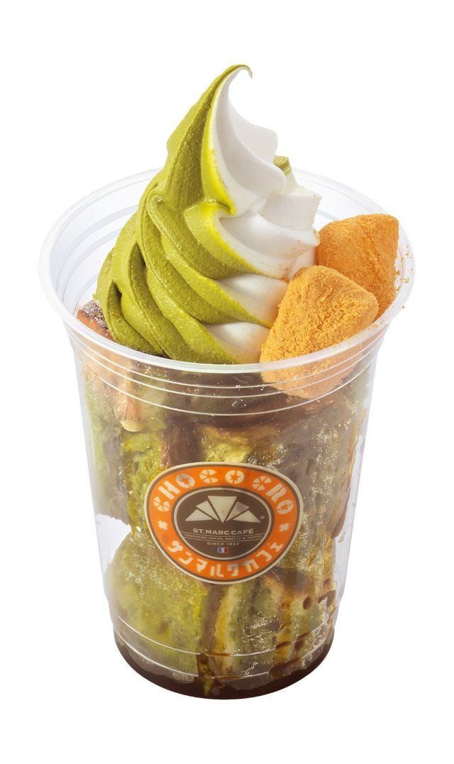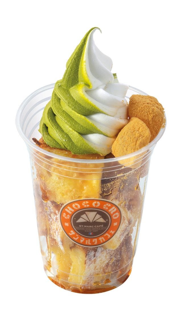 「カップデニッシュ 抹茶〜わらび餅添え〜」720円 ⾹り豊かな抹茶デニッシュのフレンチトーストに、黒蜜のコクがよく合う一品。ソフトクリームはミルク・抹茶・ミックスの3種から好きな味を選べるのもうれしい。