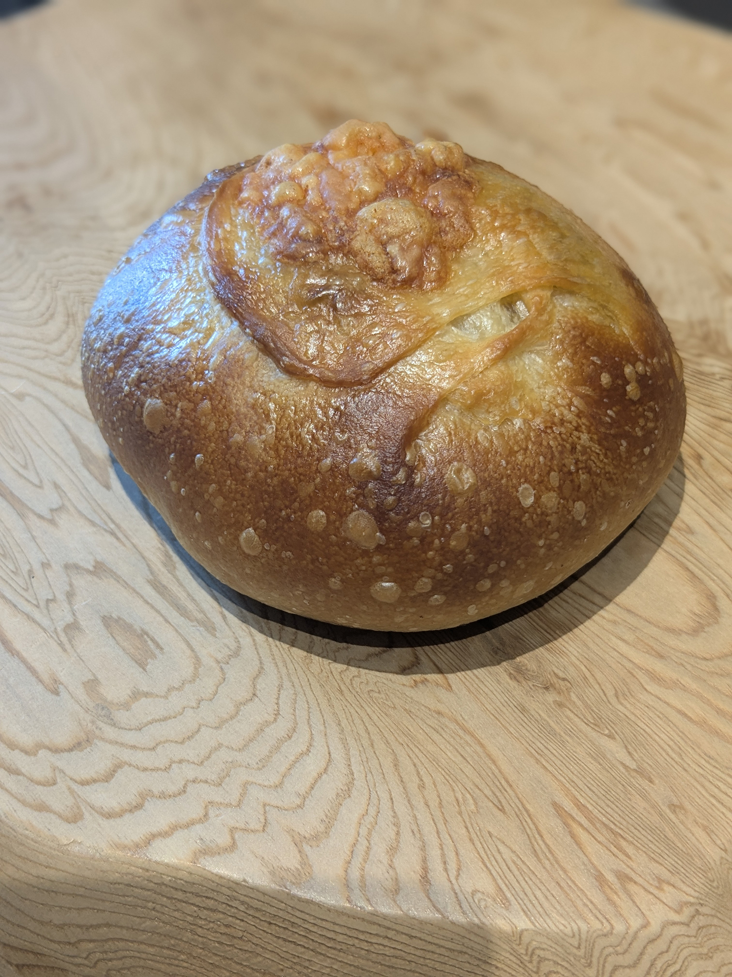 店のシンボルともいえる大きな窯で焼き上げた人気No.1の焼きカレーパン。旨みのある生地に、野菜の甘みが溶け込んだカレーとスイス産グリエールチーズを合わせ、コク深く仕上げおり、外は香ばしく中はとろける食感で、満足感のある一品。噛むたびに広がる素材のコクと、焼き立てならではの奥深い風味をぜひ堪能してみて。