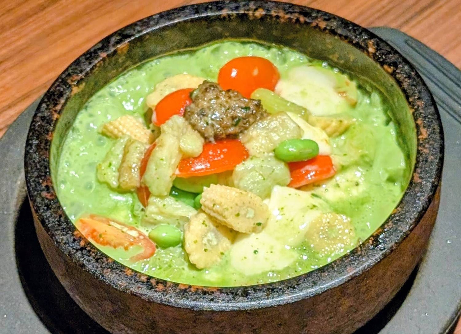 鮮やかな抹茶のグリーンと、とろけるモッツァレラチーズのコントラストが食欲をそそる一品。濃厚な抹茶クリームソースにフレッシュモッツァレラを合わせ、彩り豊かな4種の野菜を贅沢に使用することで、コクと軽やかさが調和した味わいに仕上げている。仕上げにトッピングした味噌ナードソースが芳醇な香りと深みをプラス。石焼ならではの熱々でクリーミーな口当たりを楽しんでみて。