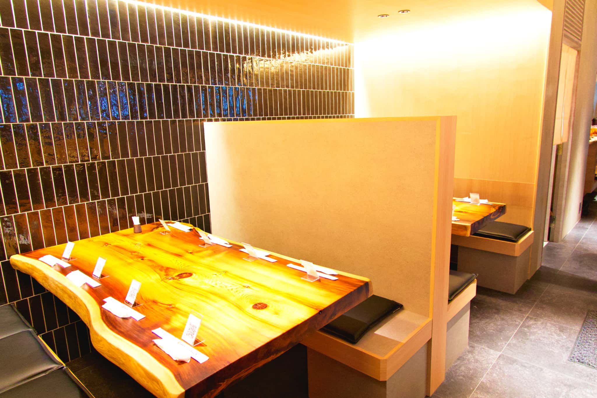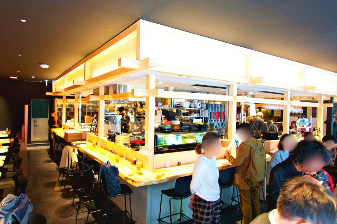 席種も豊富で、中央に配されたオープンキッチンを囲むカウンター席では、串を焼く炎や牡蠣をさばく手元を間近に見ながら食事が楽しめます。また、テーブル席や通りを望むテラス席もあり、一人での昼飲みから、友人や同僚とのディナーまで幅広く利用できますよ。