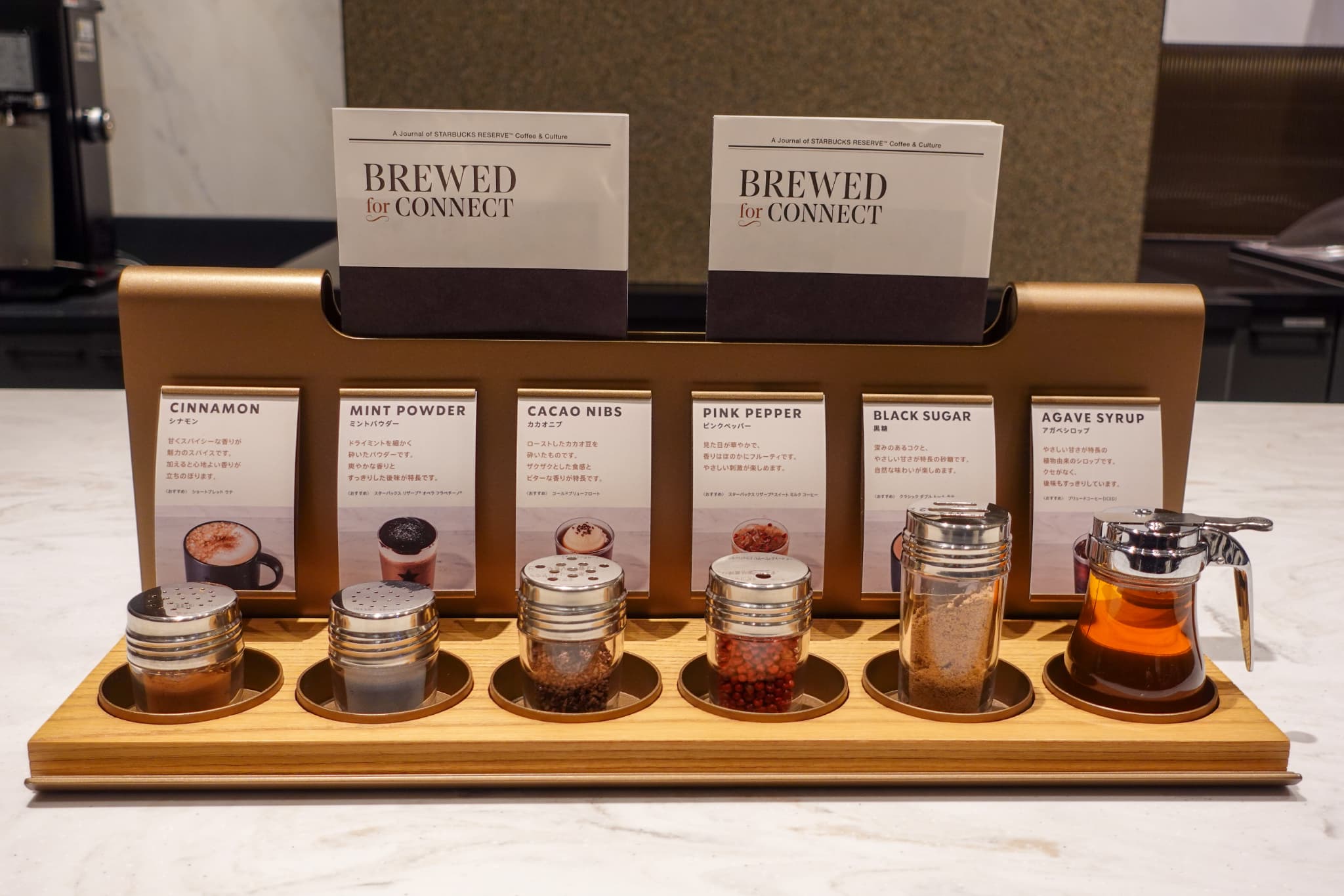 ドリンクを受け取るカウンターには、コーヒーの楽しみ方を広げるために、ちょい足しできるコンディメントを6種設置。大人の味わいにするならホロ苦いカカオニブ、まろやかにするなら黒糖、刺激を足すならピンクペッパー、気分をすっきりさせるならミントパウダーなど、気分に合わせてアレンジできます。