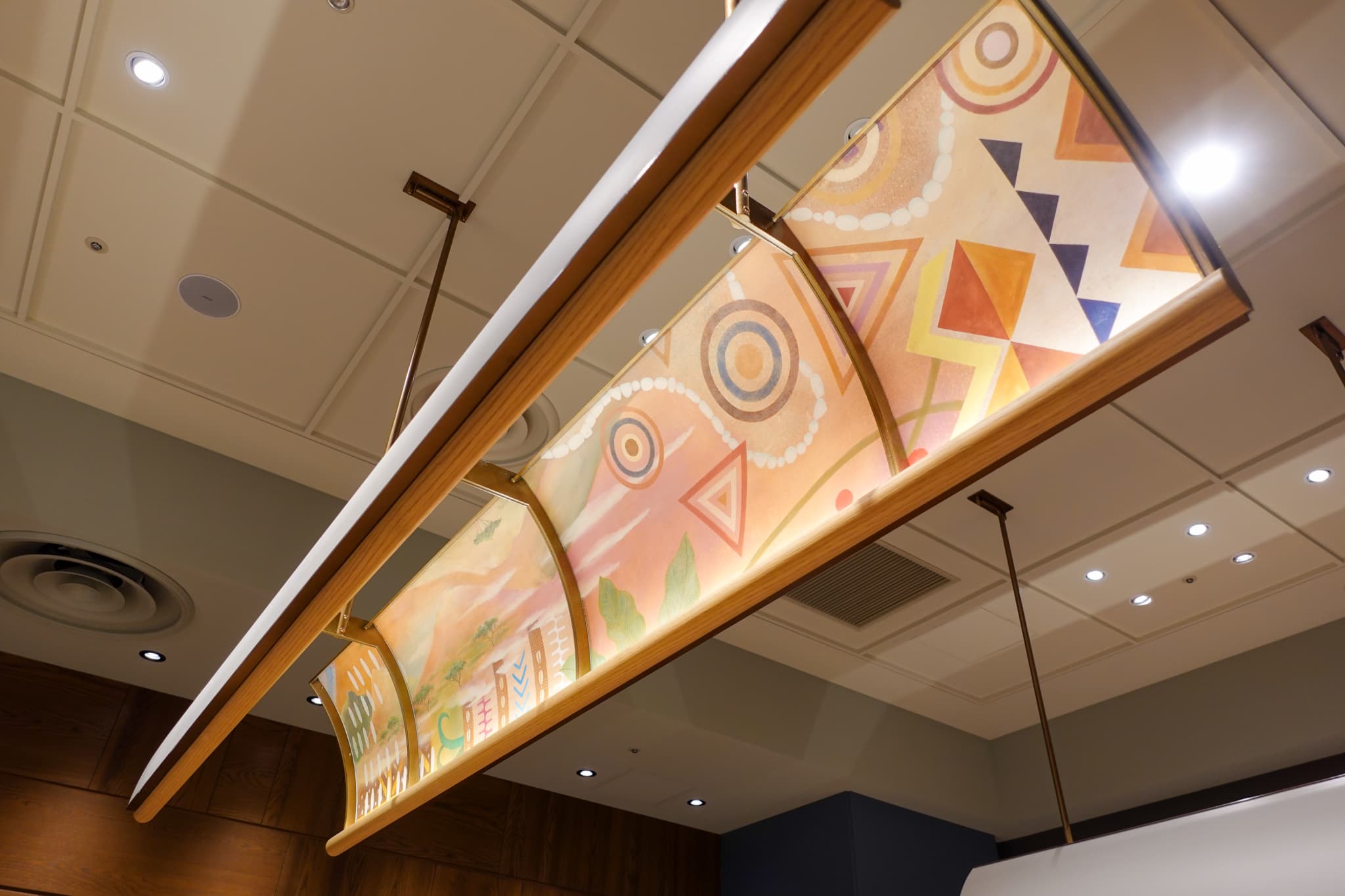 ペンダントライトの内側にはアフリカをイメージしたアートが施され、細部までこだわりが感じられる空間が広がっています。
