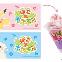 目玉商品となるポケモンフラッペは2種類。ストロベリーフラッペは、いちご果肉とちゅるんとしたゼリーを入れ、甘酸っぱいいちごの酸味と食感で最後の一口までおいしく味わえる一杯。こだわりの詰まったかき氷、果肉ソース、ゼリーと、ミルクが絶妙にマッチしている。もうひとつは、メタモン(ラプラスへんしん)と、ピカチュウ(うすいろ)をパッケージにデザインしたラムネソーダフラッペ。口の中でブドウ味のラムネが弾け、変化する味わいを楽しめる。大きい粒のかき氷を増やすことで氷の存在感を出し、最後までガリガリとした食感と爽快感が続くような仕上がりとなっている。