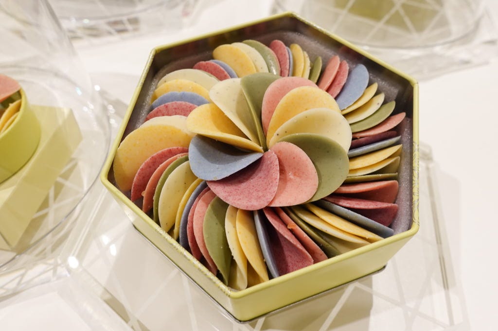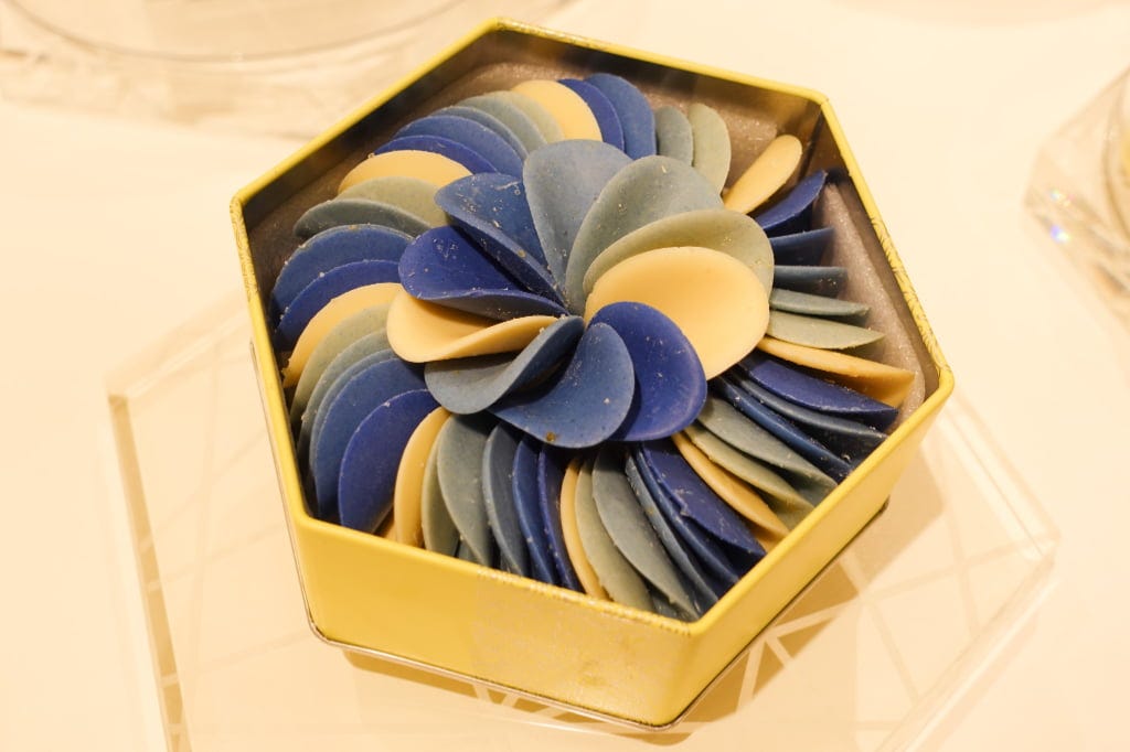 左から「蜂蜜とペタルインディゴ」「蜂蜜とペタルシトラス」各5,450円 花びらのように薄く仕上げたペタルチョコレートは、着色料を使用しない素材本来のやさしい色合いが魅力。パリっとした食感と優しい口どけを楽しめます。その美しさにうっとりと魅了される看板商品です。