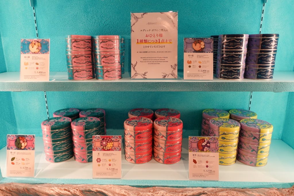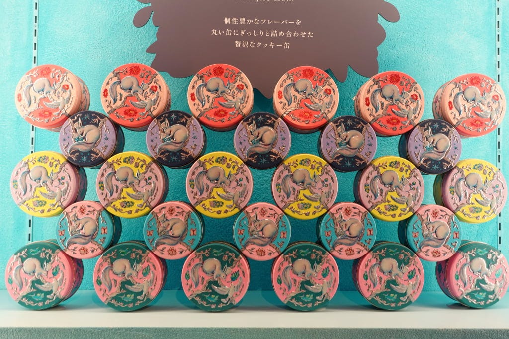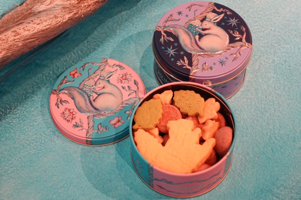 手前から「昼の森」「夜の森」各1,404円 GIN NO MORIの代名詞ともいえるクッキー缶が、「ルディック」仕様の「ルディック ボワ」に。仕切りを使わず、個性豊かなクッキーをオリジナルの丸缶にぎっしりと詰め合わせた贅沢な一缶です。1種類1点まで購入できます。