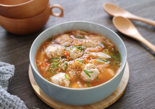 【電子レンジだけで作れる】鶏団子豆腐チゲ風スープレシピが優秀!ほわほわ食感が病みつき