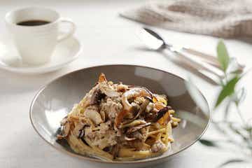 クリーム不使用でも濃厚!ワンパンでできる!焼ききのことひき肉の味噌ミルクパスタ