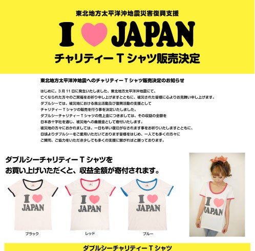 タレントの若槻千夏が18日、自身がプロデュースを手掛けるアパレルブランド「WC(ダブルシー)」のオンラインショップにて東北地方太平洋沖地震の復興支援のためのチャリティーTシャツの販売を開始した。