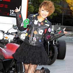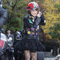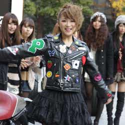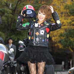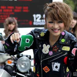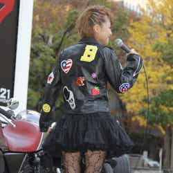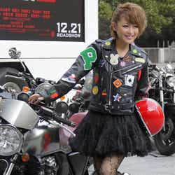 このファッションのポイントについて質問されると「ワイルドな女を演じてみましたけど、(ジャケットの)ワッペンでキュートにしてみました。ハデハデで、まさにギャルという感じでドストライクなライダーです」と笑顔になった。