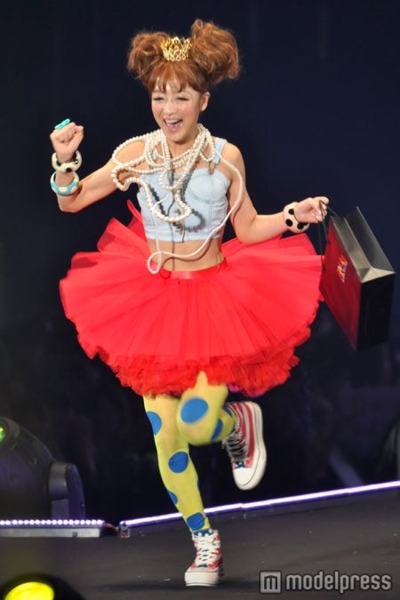 ウィッグブランド「PRISILA(プリシラ)」ステージのトップバッターをつとめた鈴木奈々は、デニムビスチェに赤のチュールスカート、黄×青の奇抜なタイツを合わせた装い。