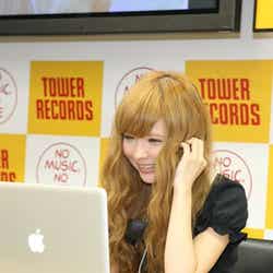 当日は新宿を拠点に、ハードなスケジュールをこなした益若。昼には人気長寿番組「笑っていいとも!」に出演し、17時からはサプライズでタワーレコード新宿店の店内に登場。イベントスペースにて、Google+ハングアウトを使い公開生チャットを開催した。