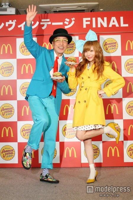益若は17日、都内で行われたマクドナルドの新商品発表会に演出家でタレントのテリー伊藤と出席。益若は、大きなリボンを頭につけ、80年代を思わせるレトロな衣装で登場した。