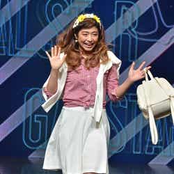 ファッションショーでトップバッターを飾った今井は、この春人気のギンガムチェックシャツに、ホワイトのサーキュラースカート、カーディガンを羽織って登場。満面の笑顔でランウェイをウォーキングすると3000人が熱狂した。