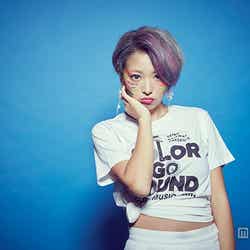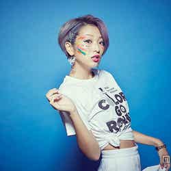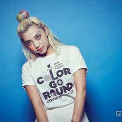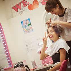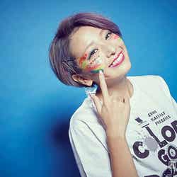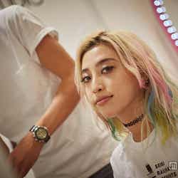 ヘアスタイルは、ホワイト系金髪をベースに、ヘアチョークで色鮮やかなハイトーンカラーを織り込んだ植野。一方、パープルなど色とりどりのアッシュカラーでまとめたなつぅみ。さらに目元や眉を、今話題の“カラーメイク”で華やかに演出し、頬にはカラフルなラインを施した。姉妹のように息のあったポージング