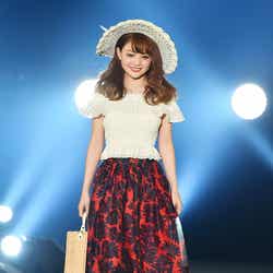 レッドの地にブラックのフラワー柄が施された大人なスカートにオフショルダーのトップス、ストローハットを合わせた上品なコーディネート。キュートにポージングをとり、大人な魅力を放っていた。