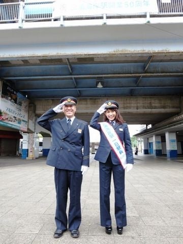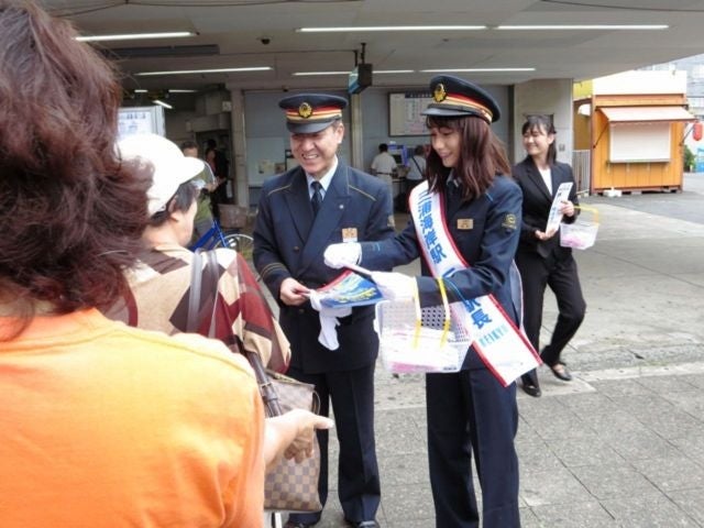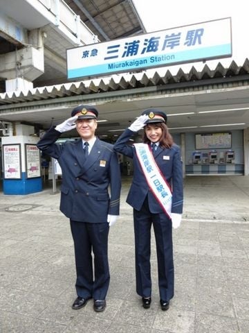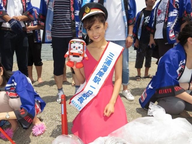 雑誌「Ranzuki」専属モデルで、「2016年なぎさイメージガール」の武田あやなが6日、京急電鉄・三浦海岸駅(神奈川県三浦市)の一日駅長に任命され、同駅のホームに水着&制帽姿で登場した。この日武田は、ホーム立哨や構内放送を行い、改札口前では駅の利用者にサンプリング活動などを行った。