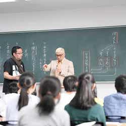 いざ、撮影が始まると「はいっ!これ入試出るよっ!」と熱く生徒に語りかける。何テイクか重ねていくと、監督からの提案で「これ、入試でるぞ。焦っちゃうぞ。ね」と優しく語りかけるパターンや、他にも「ノートに取るな!心に刻め!」など、カットの声がかかるや否や、自分で思わず笑ってしまうようなユニークなものまで数パターンを撮影。次々に出てくる要望を巧みにこなす松本だったが、撮影の途中で「試験に出るからね。試験に出ないからね。あ、どっちだったっけ?なんだったっけ?」と、混乱した様子でNGを出し照れ笑い。それにつられた撮影スタッフからも笑いが起こり、その後も終始和やかな雰囲気で撮影が進んだ。