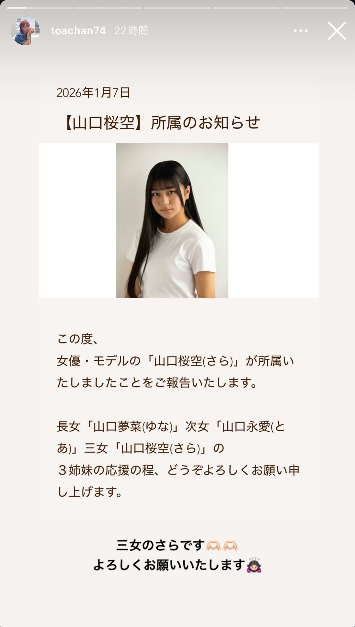 永愛は「この度、女優・モデルの『山口桜空(さら)』が所属いたしましたことをご報告いたします」と記された告知をストーリーズで紹介。「やっとちゃーちゃん(桜空)も載せれる」「さら(桜空)のアカウントもフォローしてくださいっ」と添えて、桜空と顔を寄せ合ったプライベート2ショットを投稿し、姉妹の仲むつまじい様子を公開している。また、姉の山口夢菜と永愛に続き、桜空も所属したことで3姉妹揃っての所属となる。山口永愛の投稿に反響