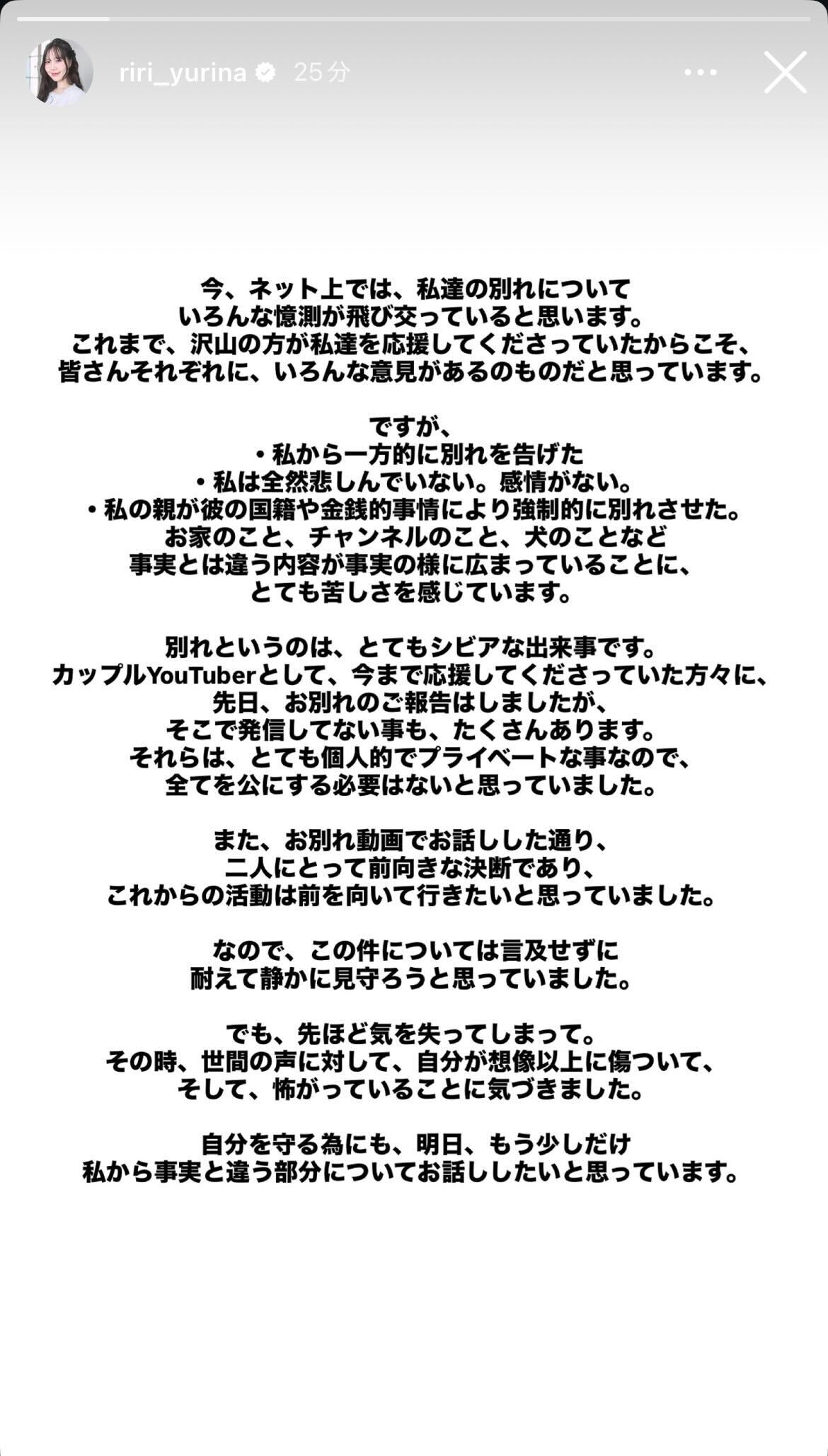 「今、ネット上では、私達の別れについていろんな憶測が飛び交っていると思います。これまで、沢山の方が私達を応援してくださっていたからこそ、皆さんそれぞれに、いろんな意見があるものだと思っています」と書き出したYurina。「ですが、・私から一方的に別れを告げた・私は全然悲しんでいない。感情がない・私の親が彼の国籍や金銭的事情により強制的に別れさせた。お家のこと、チャンネルのこと、犬のことなど事実とは違う内容が事実の様に広まっていることに、とても苦しさを感じています」とネット上の憶測について触れた。続けて「別れというのは、とてもシビアな出来事です。カップルYouTuberとして、今まで応援してくださった方々に、先日、お別れのご報告はしましたが、そこで発信していない事も、たくさんあります」と説明。「それらは、とても個人的でプライベートな事なので、全てを公にする必要はないと思っていました」と事情により話していないこともあるとし、「お別れ動画でお話しした通り、二人にとって前向きな決断であり、これからの活動は前を向いて行きたいと思っていました」と前向きに伝えた。