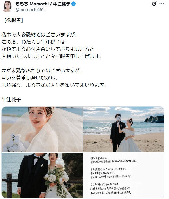 ももちは「この度、わたくし牛江桃子はかねてよりお付き合いしておりました方と入籍いたしましたことをご報告申し上げます」と発表。「まだ未熟なふたりではございますが、互いを尊重し合いながら、より強く、より豊かな人生を築いてまいります」とつづった。投稿では、純白のウエディングドレスを着用したももちの写真をはじめ、夫との2ショットや直筆の文書が公開されている。結婚発表・“ももち”こと牛江桃子って?
