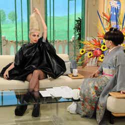 レディー・ガガは黒柳徹子のヘアを意識したブラックのドレスに、日本人デザイナー・NORITAKA TATEHANAが手がけた厚底ブーツで登場。そのインパクト抜群のいでたちに、黒柳徹子も「あまりのことにビックリしております」と驚きを隠せない様子であった。