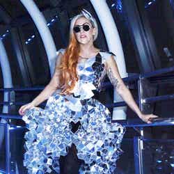 地上350メートルにある天望デッキに来場したガガは、スカイツリーをイメージしたかのようなシルバーのきらびやかなドレス姿。ヒップ部分がお目見えする大胆なデザインで、サングラスを着用していた。