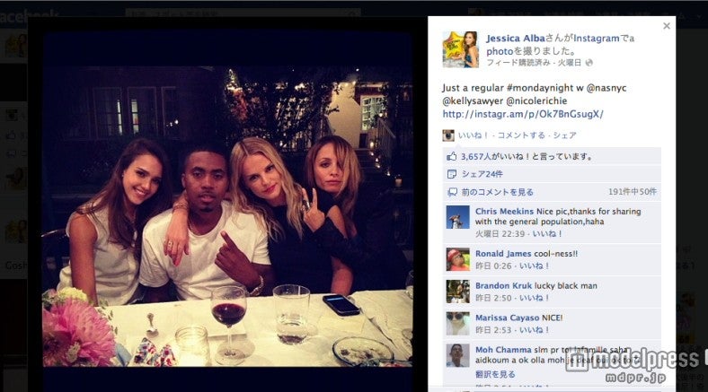 ジェシカのコメントは「Just a regular #mondaynight w @nasnyc @kellysawyer @nicolerichie」(いつも通りの月曜の夜、ナズ、ケリー、ニコールと一緒)。
