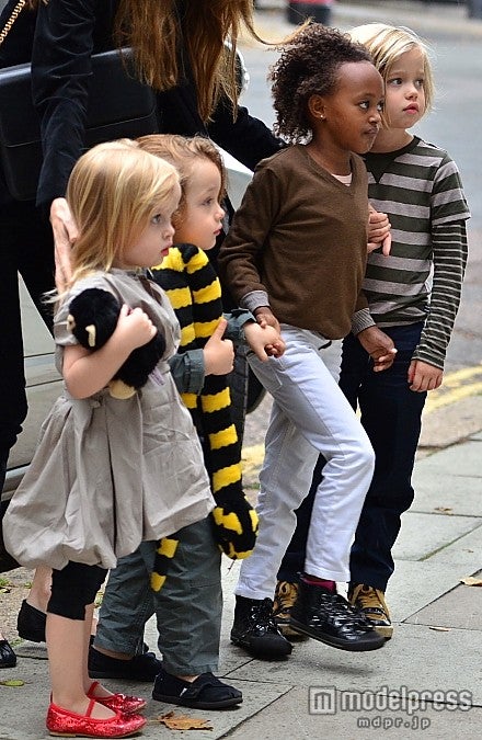 今年4月に晴れて婚約したアンジーとブラピが伴っていたのは、ザハラちゃん(7)、シャイロちゃん(6)とふたごのノックス君(4)&ヴィヴィアンちゃん(4)。ヴィヴィアンちゃんはアンジー主演の映画『マレフィセント/Maleficent』で映画デビューが決まった、今、注目のセレブキッズです。