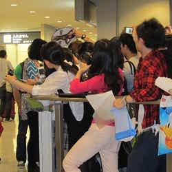 今日は、午後早めからケイティを出迎えようと、大勢のファンがロビーにて待機。取材のカメラマンさんたちから、「外でファンが待っているよ」と聞いたケイティは飛行機を降りてからちょっとトイレに寄ったとか。そしてロビーに登場!! 大歓迎を受けました!!
