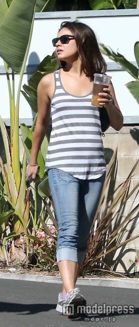 この日、2人は友人宅を訪問。10月末でもLAは暖かいようで、ミラはデニムにストライプのタンクトップという夏のようなファッション。なのですが……、よーく見るとお腹のあたりがポッコリ!!!! そのため週末には、妊娠説が一気に駆けめぐる事態になりました。